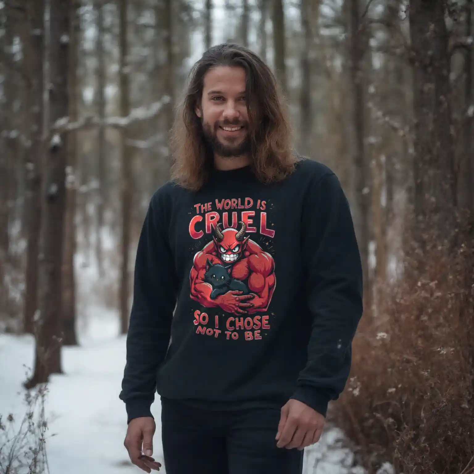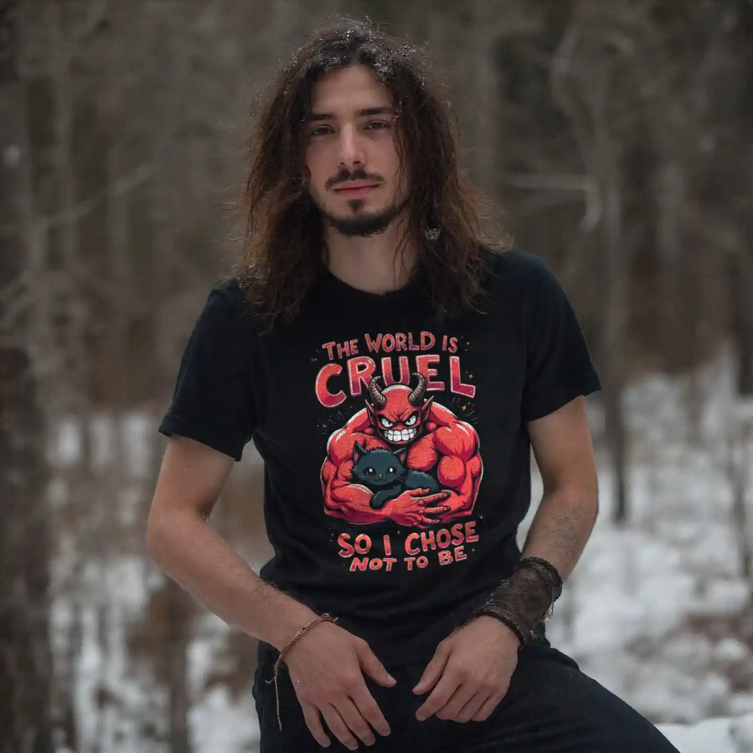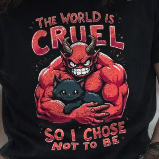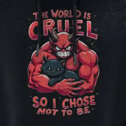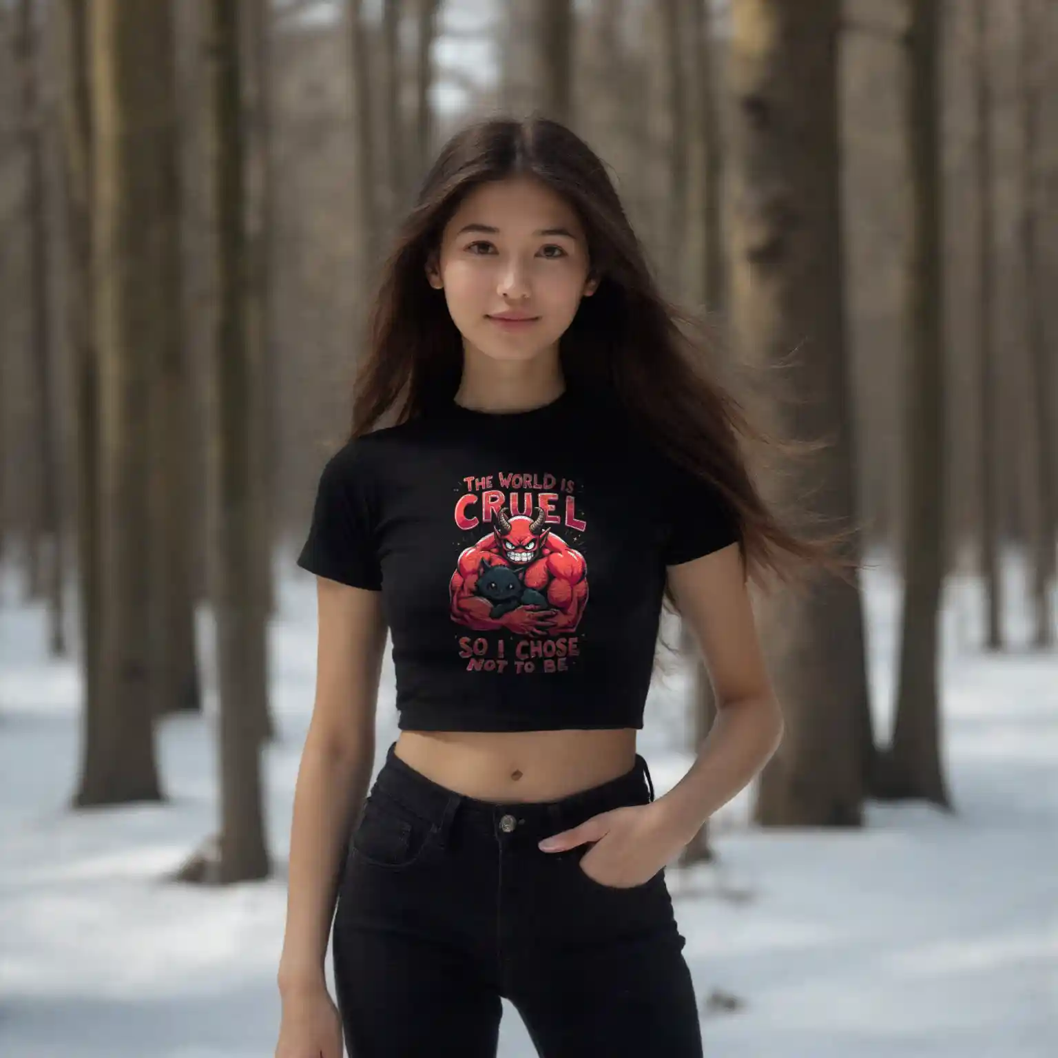 Manchmal darf es auch ein wenig bauchfrei sein – vor allem, wenn du ein echtes Statement setzen möchtest. Das Cruel World Crop-Top kombiniert einen modischen Schnitt mit einer ausdrucksstarken Botschaft. Besonders für den Sommer oder dein nächstes Festival ist dieses kurz geschnittene Shirt ideal, um im heißen Wetter einen kühlen Kopf zu bewahren und gleichzeitig Blicke auf dich zu ziehen. Das Motiv zeigt einen mächtigen, rot gezeichneten Dämonen, der zärtlich eine Katze im Arm hält, während der Schriftzug The world is cruel so I chose not to be klarmacht: Wir leben zwar in einer oft grausamen Welt, aber du entscheidest selbst, ob du mehr Leid hinzufügen möchtest oder nicht.