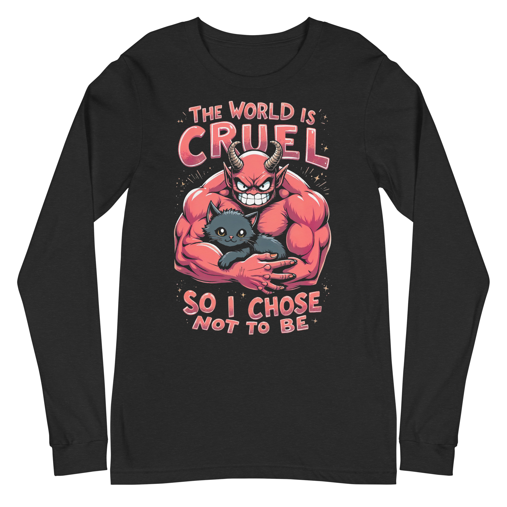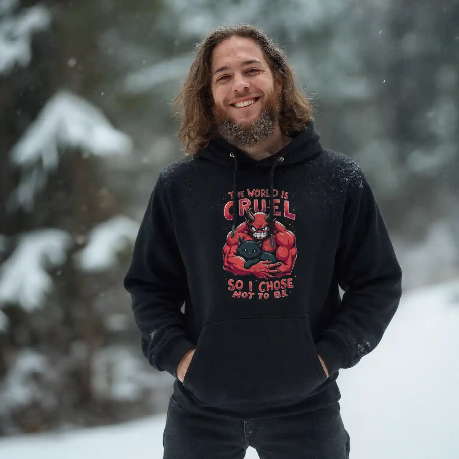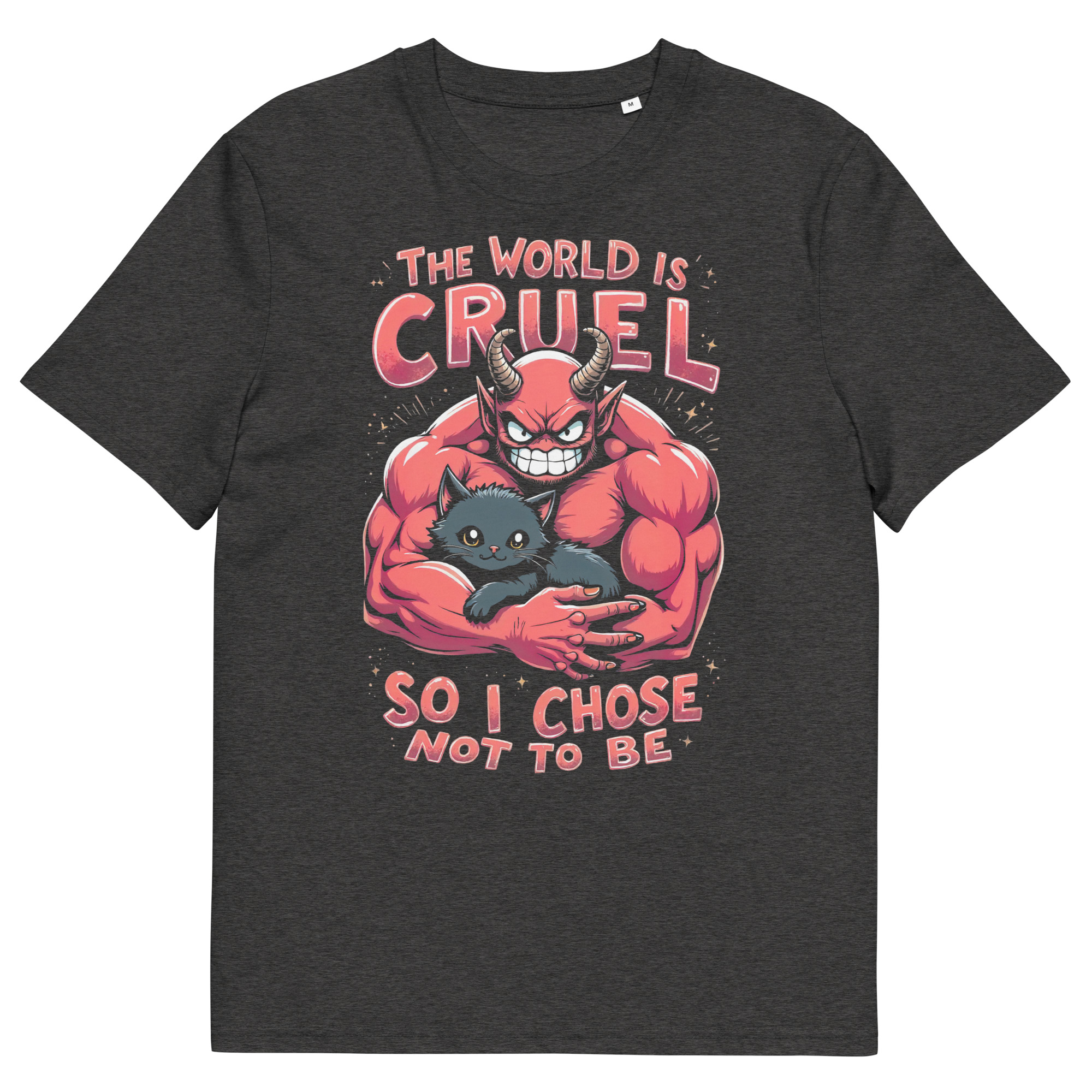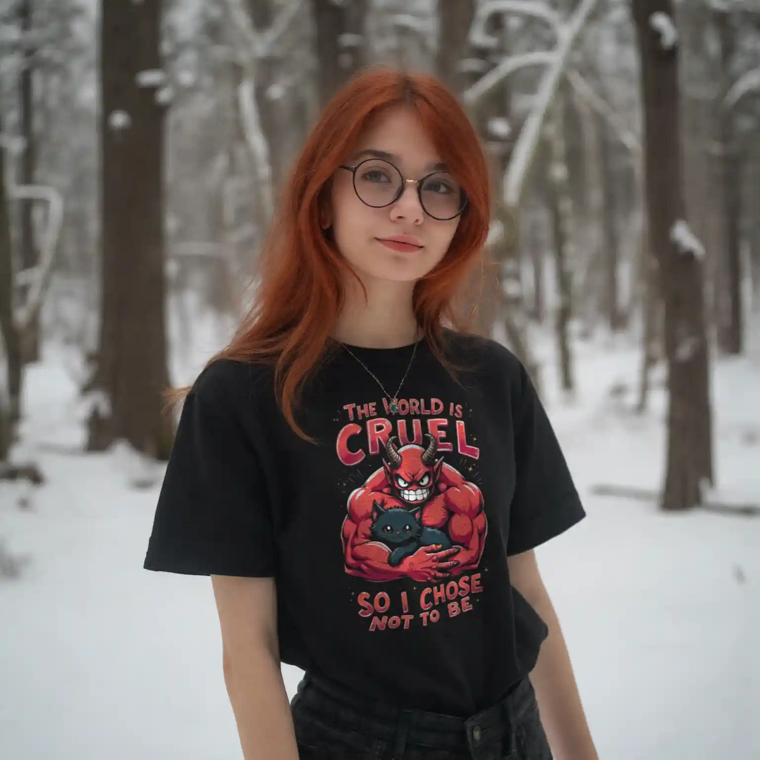 Manchmal darf es auch ein wenig bauchfrei sein – vor allem, wenn du ein echtes Statement setzen möchtest. Das Cruel World Crop-Top kombiniert einen modischen Schnitt mit einer ausdrucksstarken Botschaft. Besonders für den Sommer oder dein nächstes Festival ist dieses kurz geschnittene Shirt ideal, um im heißen Wetter einen kühlen Kopf zu bewahren und gleichzeitig Blicke auf dich zu ziehen. Das Motiv zeigt einen mächtigen, rot gezeichneten Dämonen, der zärtlich eine Katze im Arm hält, während der Schriftzug The world is cruel so I chose not to be klarmacht: Wir leben zwar in einer oft grausamen Welt, aber du entscheidest selbst, ob du mehr Leid hinzufügen möchtest oder nicht.