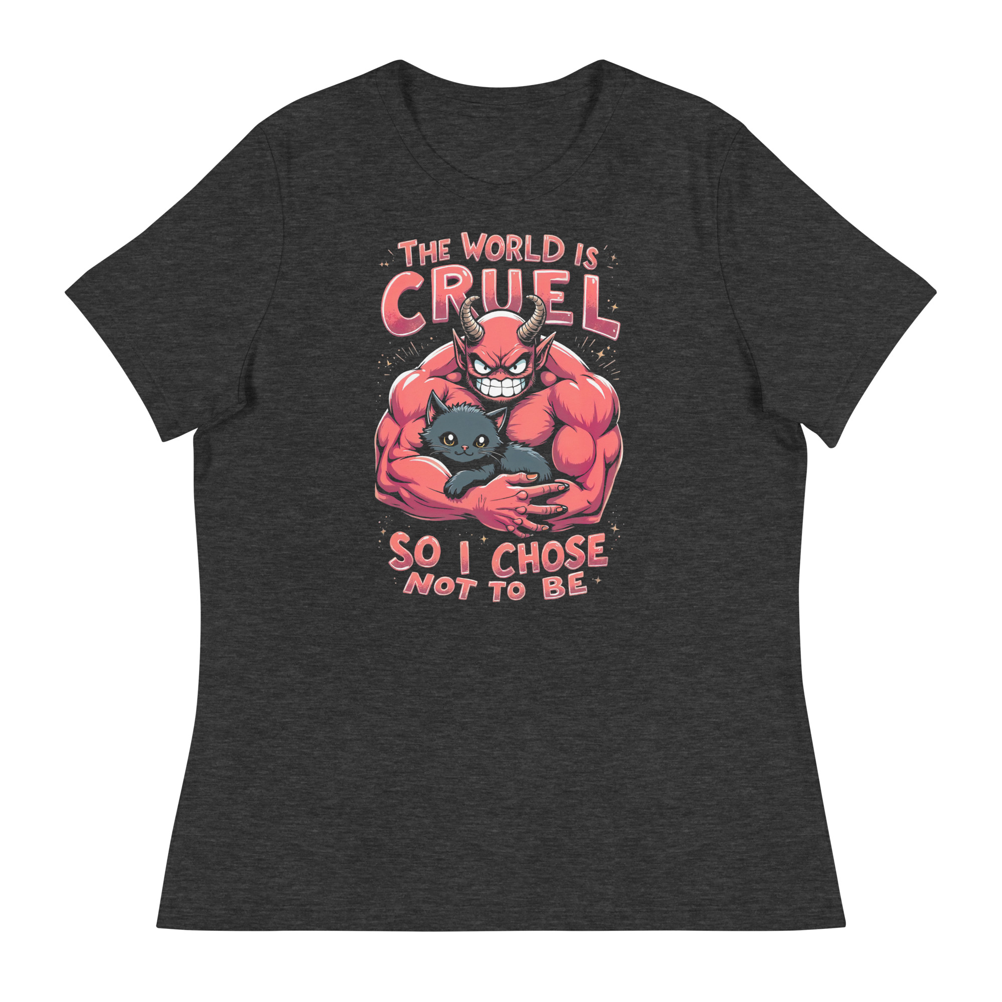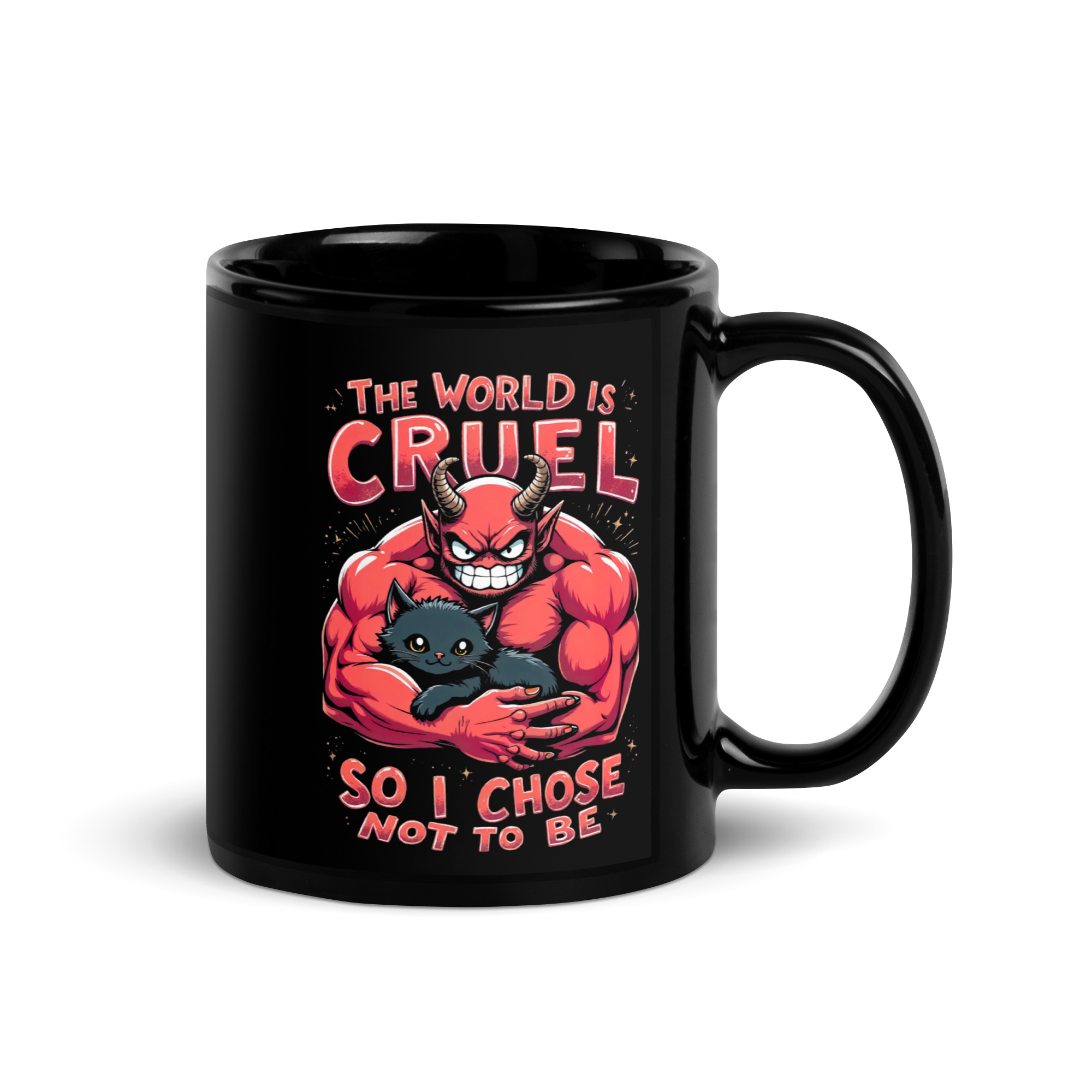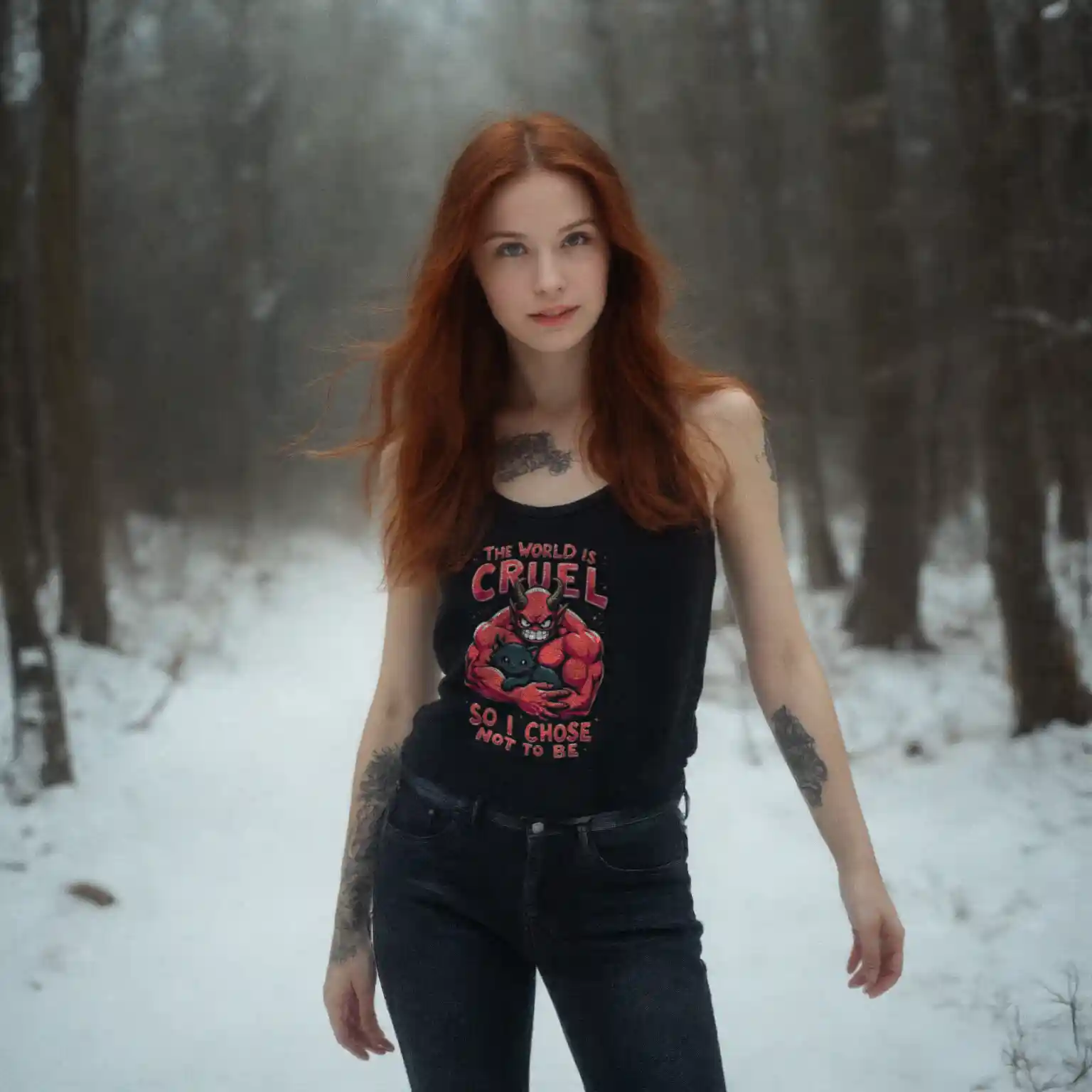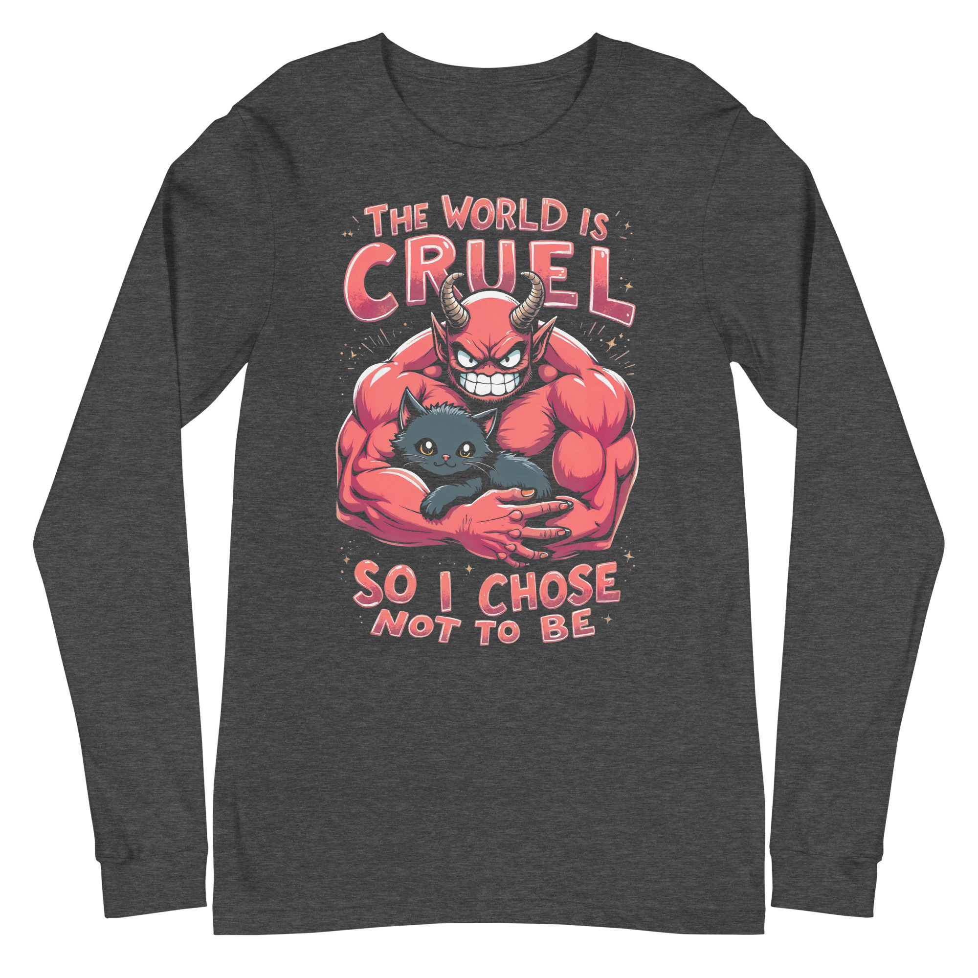 Manchmal darf es auch ein wenig bauchfrei sein – vor allem, wenn du ein echtes Statement setzen möchtest. Das Cruel World Crop-Top kombiniert einen modischen Schnitt mit einer ausdrucksstarken Botschaft. Besonders für den Sommer oder dein nächstes Festival ist dieses kurz geschnittene Shirt ideal, um im heißen Wetter einen kühlen Kopf zu bewahren und gleichzeitig Blicke auf dich zu ziehen. Das Motiv zeigt einen mächtigen, rot gezeichneten Dämonen, der zärtlich eine Katze im Arm hält, während der Schriftzug The world is cruel so I chose not to be klarmacht: Wir leben zwar in einer oft grausamen Welt, aber du entscheidest selbst, ob du mehr Leid hinzufügen möchtest oder nicht.