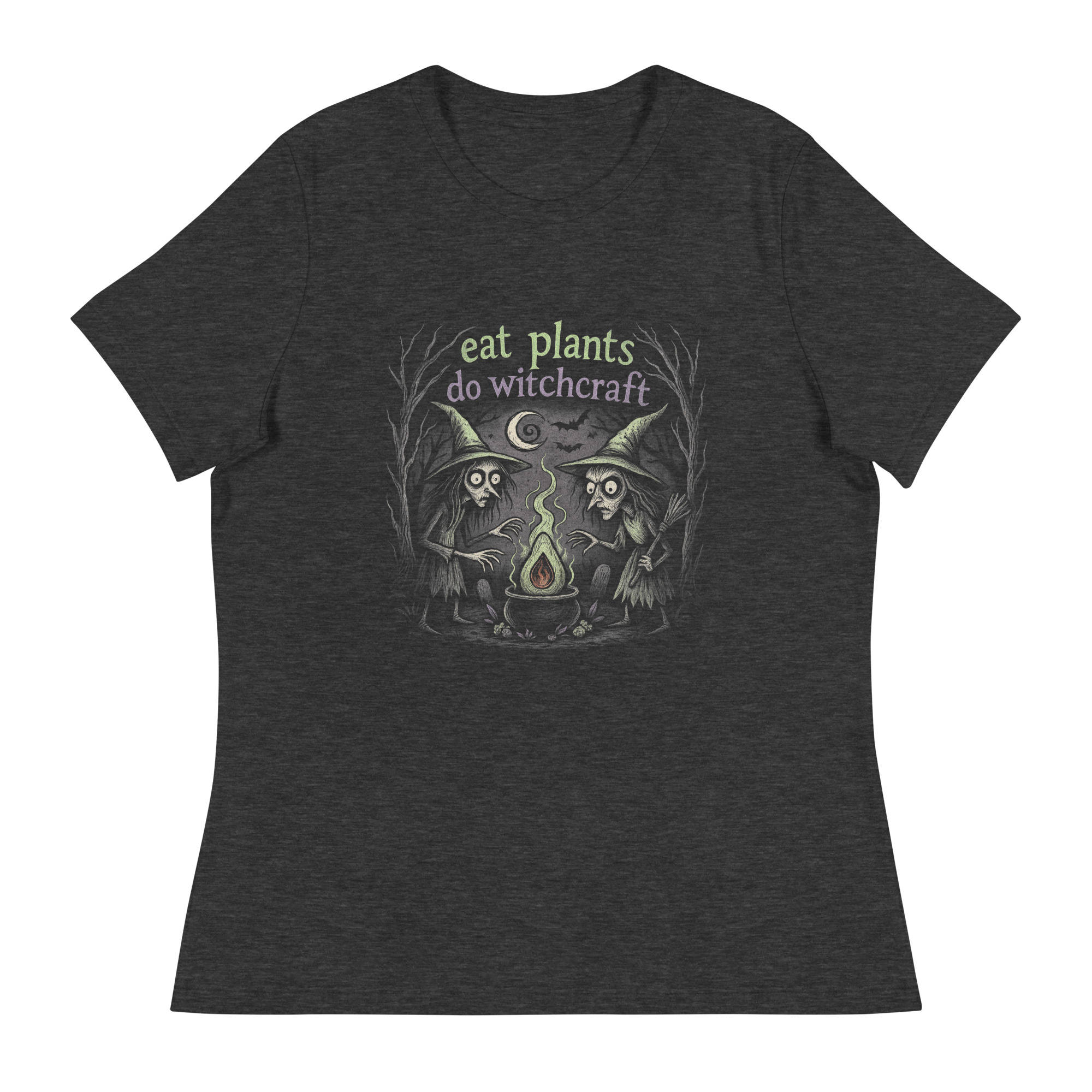 Das Eat Plants Do Witchcraft (Halloween) T-Shirt ist ein düsteres Fashion-Statement für alle, die Halloween lieben und vegane Botschaften mit okkulter Symbolik kombinieren wollen. Das Motiv zeigt zwei Hexen, die um einen brodelnden Kessel tanzen und eine Suppe kochen, die so aussieht, als sei sie reine Zauberei. Die Devils Avocado im Zentrum symbolisiert pflanzliche Ernährung – ein Verweis darauf, dass wahre Kochkunst wie Hexerei ist.