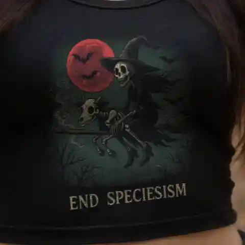 Inhaltlich liefert End Speciesism genau die Mischung, die gut ankommt: eine prägnante Botschaft, verpackt in düstere, verspielte Vibes. Es ist eine Einladung, Werte zu teilen, ohne den Zeigefinger zu heben. Freundinnen und Freunde, Kolleginnen und Kollegen oder Menschen auf Konzerten sprechen dich oft darauf an – und du hast die perfekte Gelegenheit, über Tierrechte, Empathie und Gleichbehandlung zu reden. Das Shirt zeigt, dass Veganismus nicht nur eine Ernährungsweise ist, sondern eine Haltung, die Respekt und Humor vereint.