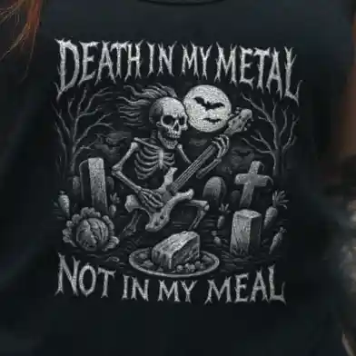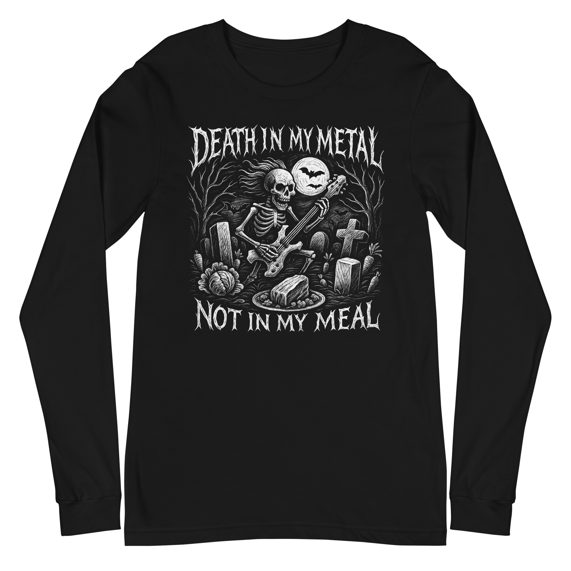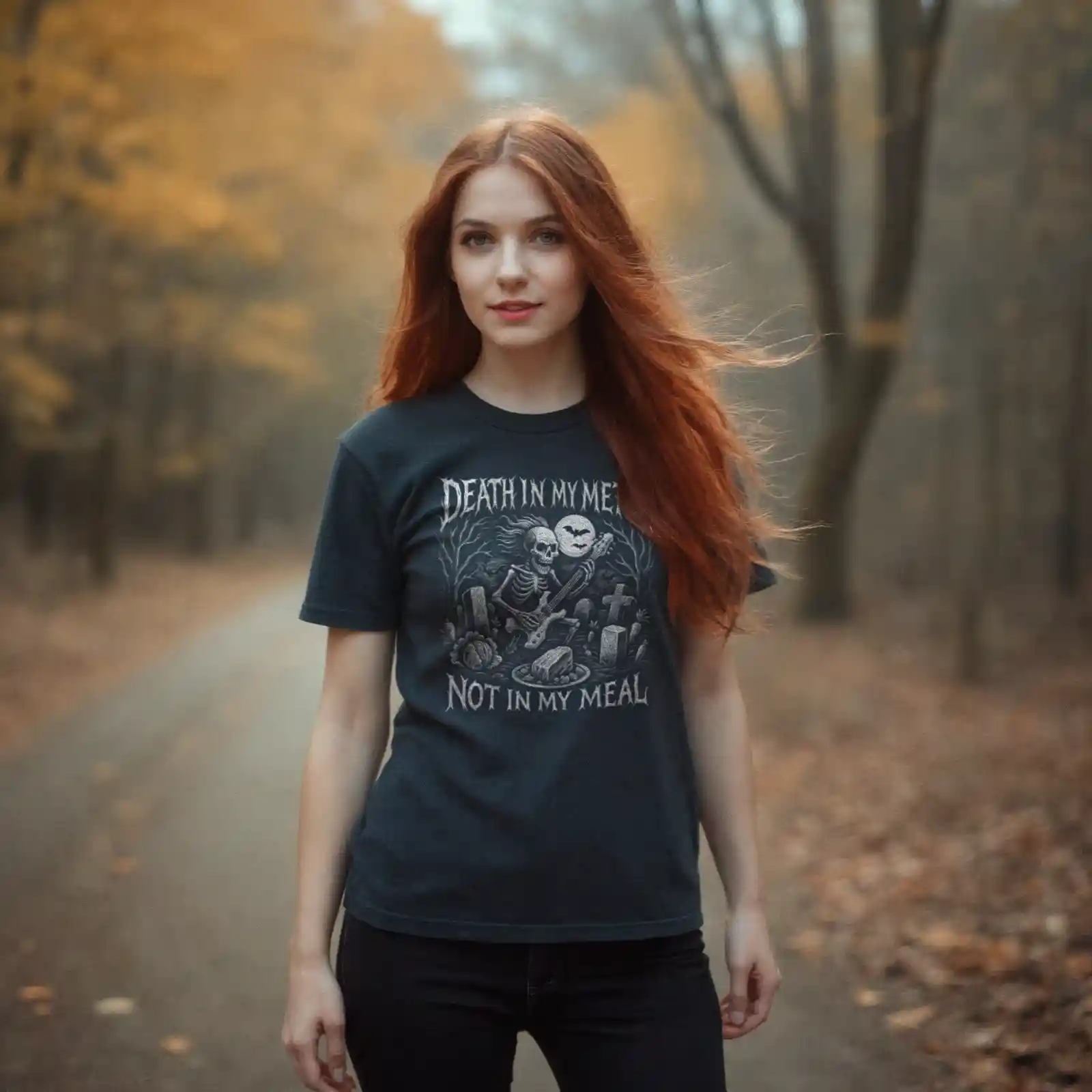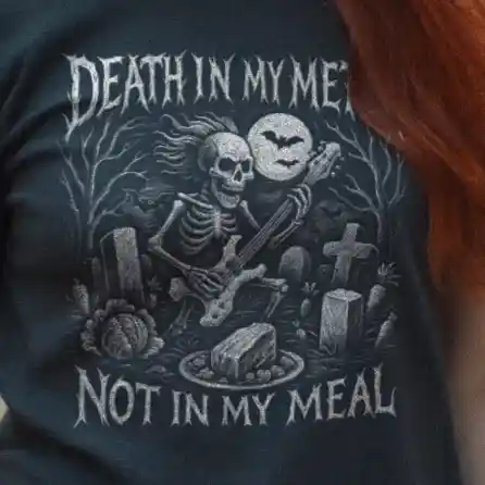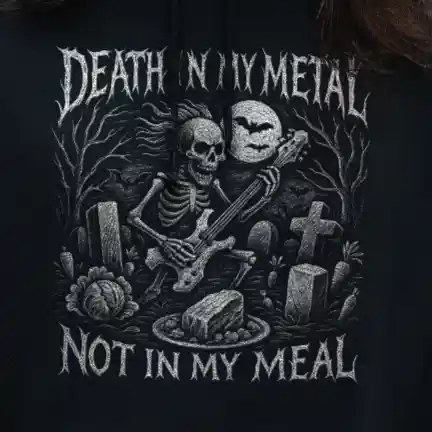 Das Death in my Metal (Halloween) T-Shirt ist ein gnadenlos düsteres Fashion-Statement für alle, die Death Metal, Black Metal und Veganismus vereinen wollen. Auf dem Motiv thront ein Skelett mit E-Gitarre, das auf einem Friedhof spielt. Über ihm strahlt der Vollmond, während Grabsteine, Salatköpfe, Karotten und vegane Gerichte die Szene umranden. Der Schriftzug Death in my Metal, Not in my Meal macht unmissverständlich klar: Tod gehört in deine Musik – niemals aber auf deinen Teller.